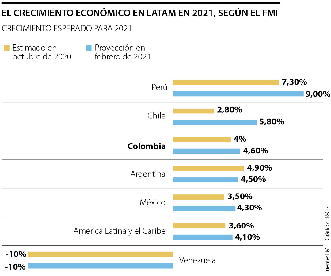 Sin embargo, el panorama del país es mucho más incierto que el de sus vecinos, pues la falta de claridad sobre el manejo de los programas de vacunas y la expectativa sobre la fecha de inicio de la inmunización puede cambiar las proyecciones que el FMI dispuso para Colombia y modificar la proyección de estabilización del crecimiento de 3,7 que el organismo hizo para 2022.