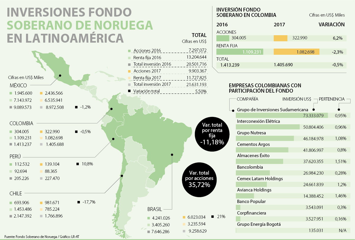 En 2016, los noruegos habían llevado a cabo una inversión en Colombia de US$1.413 millones, cifra ligeramente más alta que la actual, sin embargo, hay que tener en cuenta que ese año contaba con inversión en Davivienda y Ecopetrol. La inversión en acciones de empresas colombianas, que asciende a US$ 322,9 millones, está liderada por el Grupo de Inversiones Sudamericana e Interconexión Eléctrica, en los cuales invirtió US$73,33 millones y US$50,80 millones, respectivamente. En total, en las cuatro primeras invirtió US$212 millones (ver gráfico). Luego, le siguen compañías como: Grupo Nutresa, Cementos Argos, Almacenes Éxito, Bancolombia, Cemex Latam Holdings, Avianca Holdings, Banco Popular, Corpfinanciera y el Grupo Energía Bogotá.
