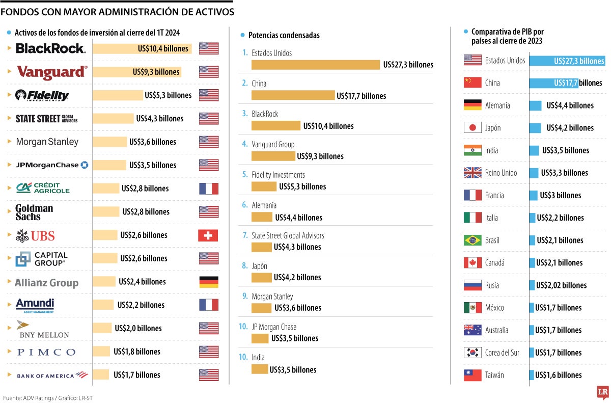 Esos billonarios activos, comparado con el Producto Interno Bruto, PIB, de las grandes potencias se reflejaría con fuerza. EE.UU. es la principal economía del mundo, seguido de China con US$17,7 billones, en tercero, cuarto y quinto lugar quedarían BlackRock, Vanguard y Fidelity, respectivamente.