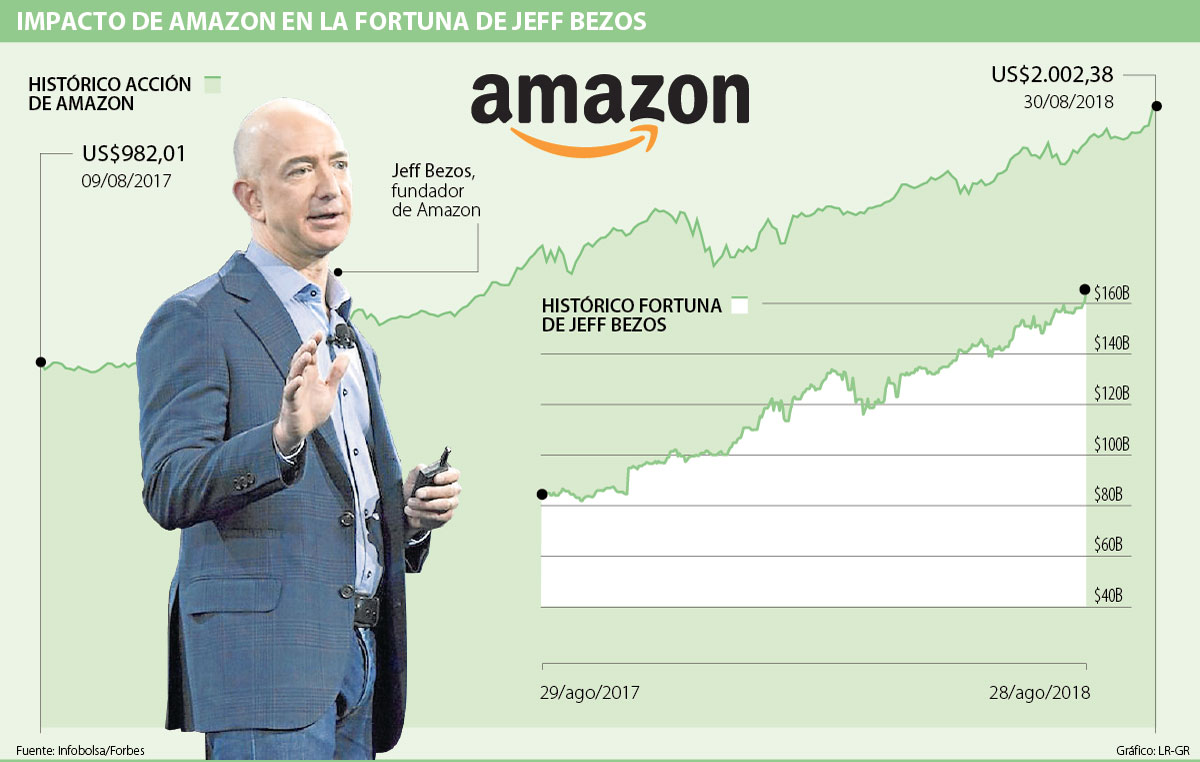 La valorización progresiva de Amazon, la compañía de comercio electrónico más importante del mundo encabezada por Jeff Bezos, ha hecho que su fortuna, la cual ya alcanza US$164.000 millones, sea equitativa al 54% del PIB colombiano teniendo en cuenta que este, al cierre de 2017 quedó en US$304.268 millones.