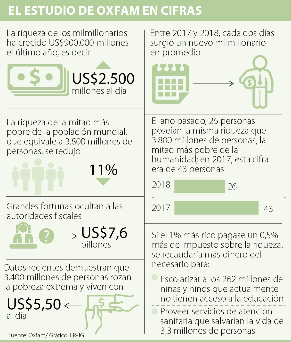 “En los 10 años posteriores a la crisis económica, el número de milmillonarios se ha duplicado. El capital de los ricos se ha incrementado en US$900.000 millones tan solo en el último año, eso es 12%”, reza el informe.