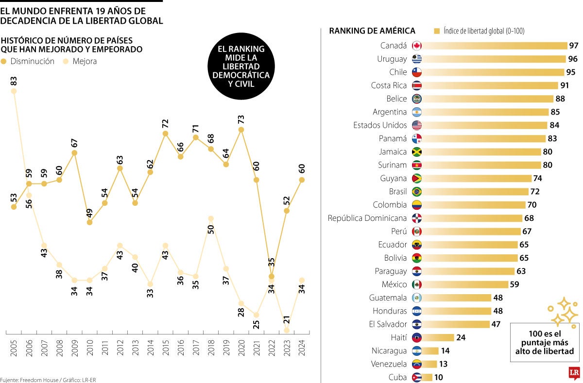 Freedom House lanzó su más reciente ranking sobre los países más libres en términos políticos, democráticos y económicos en el mundo. En América, Canadá, Uruguay y Chile son las economías con mayor libertad, con un puntaje de 97, 96 y 95, sobre 100, respectivamente, siendo 0 la calificación más baja de libertad y 100 la más alta.