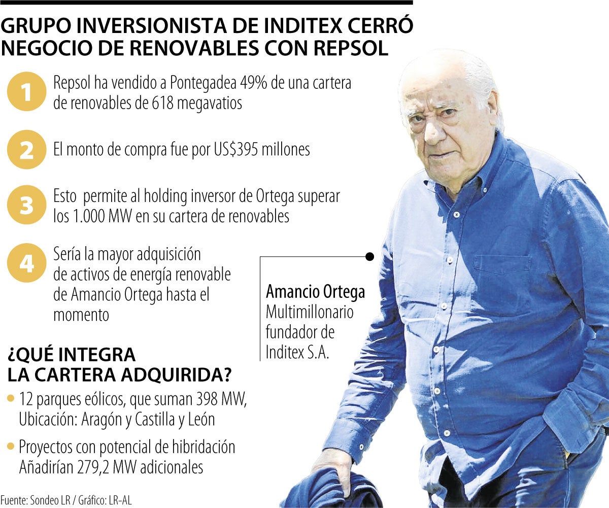 La medida consolida la reciente apuesta del family office de Ortega en Pontegadea por la energía y fuera del inmobiliario, el sector en el que más ha invertido. Se trata del tercer acuerdo alcanzado con Repsol, tras las adquisiciones en 2021 de una participación de 49% en el parque eólico Delta de la petrolera por US$265 millones y de otro 49% de la planta más pequeña de Kappa el año pasado.