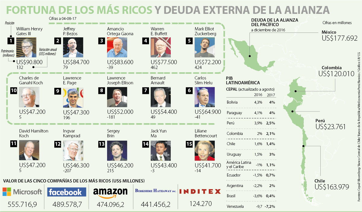 En el tercer lugar, le sigue el fundador de Zara, Amancio Ortega (US$83.600 millones), compañía que pertenece al grupo multinacional español Inditex que tiene una capitalización bursátil de US$124.270 millones. De manera que si se suman las fortunas de estos tres personajes, podrían pagar dos veces la deuda externa de Colombia, que en diciembre del año pasado registró US$120.010 millones. De igual forma, la sumatoria del patrimonio de los siete mayores multimillonarios, en donde alcanzan a entrar empresarios como Warren Buffett o Carlos Slim, puede ayudar a pagar la deuda externa que registró la Alianza del Pacífico a diciembre cuando alcanzó US$485.442 millones.
