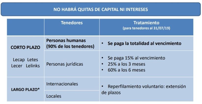 1. Extender el vencimiento de la deuda de corto plazo, Letes y Lecaps, para inversores institucionales y no para personas humanas, que cobrarán la totalidad de sus acreencias en tiempo y forma. Sobre esos inversores a los que les extenderán los vencimientos entre 3 y 6 meses, Lacunza dijo que son alrededor del 10% y que también cobrarán sin quita.