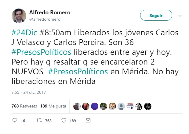 Así lo dio a conocer en su cuenta de Twitter Alfredo Romero, director de la ONG de derechos humanos Foro Penal, quien también informó que encarcelaron a dos opositores más en Mérida.