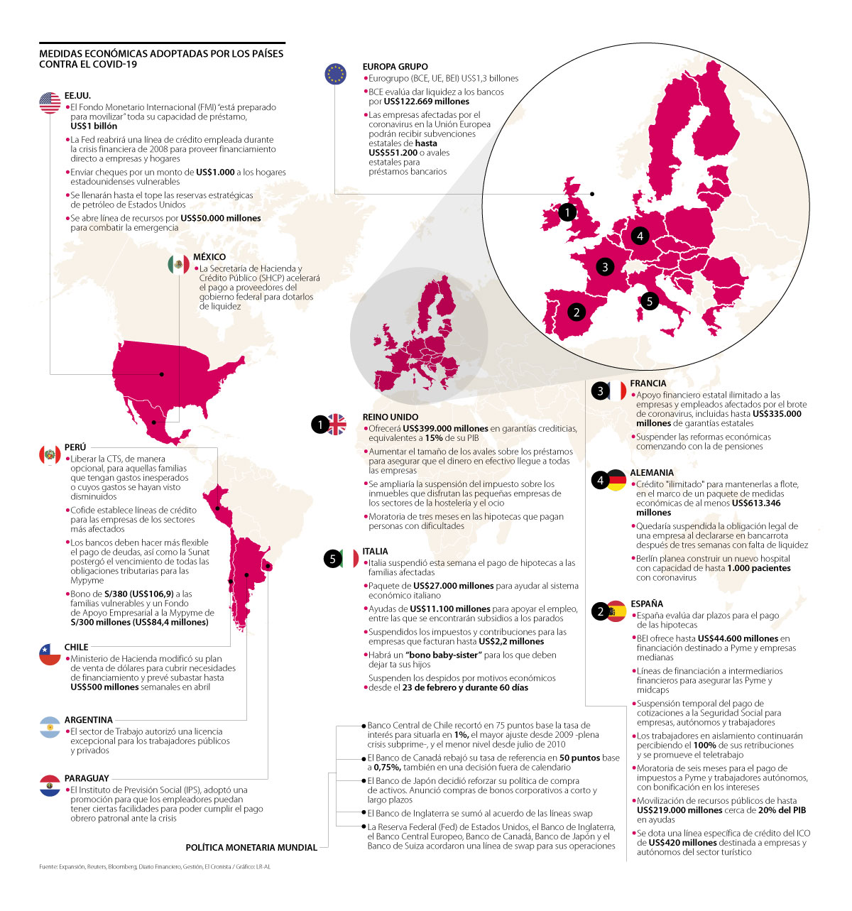 Francia, por ejemplo, suspendió las reforma pensional que venía adelantando y anunció US$335.000 millones para apoyo financiero estatal ilimitado a las empresas y empleados afectados por el brote; Alemania también liberó créditos para apoyar a las empresas dentro de un paquete de medidas con recursos por US$613.346 millones, mientras que el Reino Unido ofrecerá US$399.000 millones en garantías crediticias y dio tres meses de mora el pago de hipotecas.
