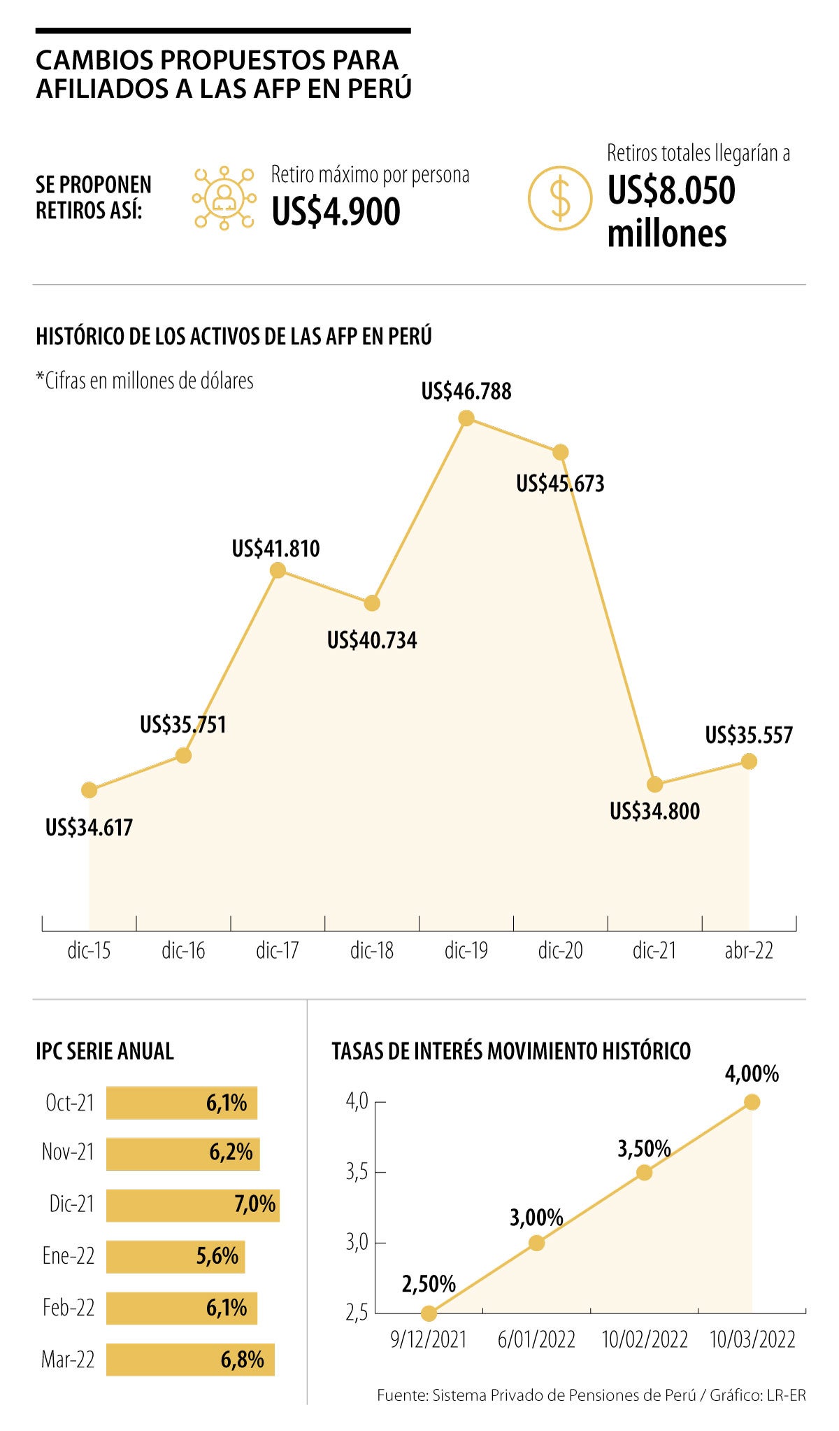 El martes 12 de abril la Comisión de Economía, Banca, Finanzas e Inteligencia Financiera del Congreso de Perú aprobó el dictamen que autoriza a todos los afiliados el retiro de hasta el equivalente de US$4.900 por persona, de sus fondos en los fondos privados.