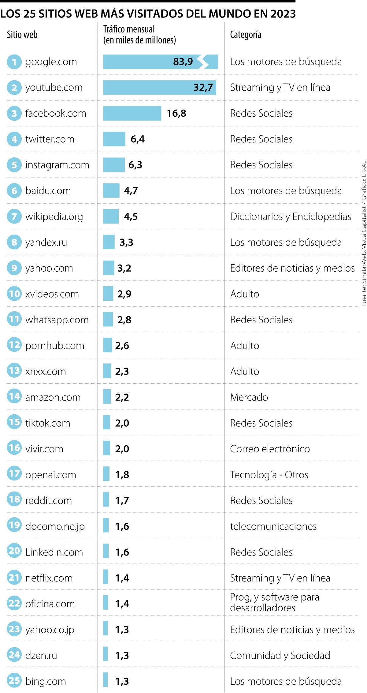 Un ranking de Visual Capitalist a partir de datos de SimilarWeb indica que Google es el rey de los sitios web con un tráfico mensual de 83.900 millones de visitas al mes. YouTube que, de hecho es filial de Google, está en el segundo lugar con 32.700 millones de visitas al mes.