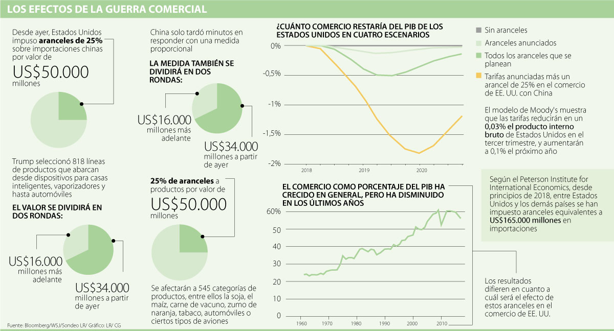 China tardó menos de cinco minutos en responder ayer a los aranceles que Estados Unidos le impuso. La reacción, tal como lo había prometido, fue proporcional y al final ambas potencias aplicaron tarifas de 25% a productos equivalentes a US$34.000 millones. Según el Peterson Institute for International Economics, desde principios de 2018, entre Estados Unidos y los demás países se han impuesto aranceles equivalentes a US$165.000 millones en importaciones.