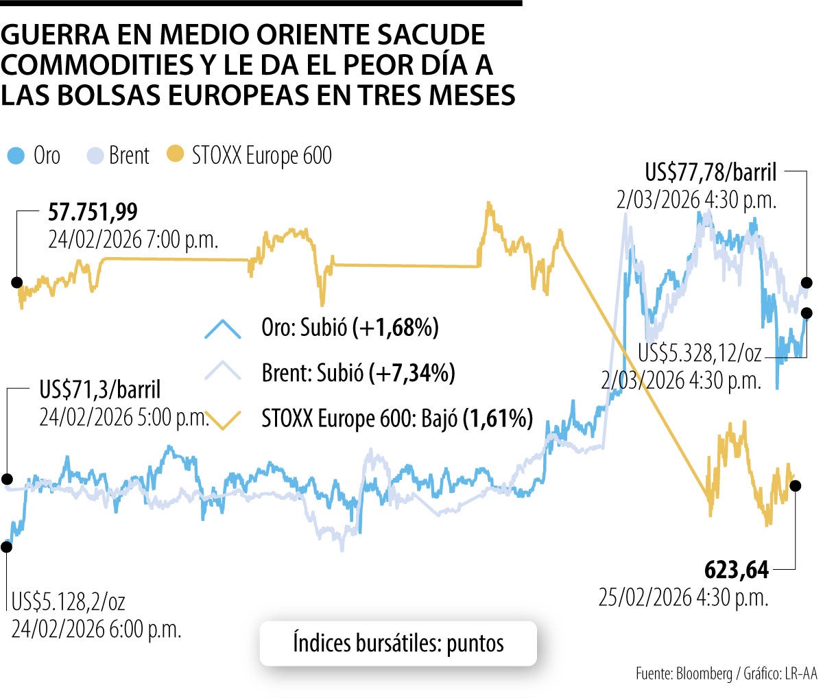 El petróleo Brent llegó a subir hasta 13% durante la jornada y cerró con un alza de 7,3%, en US$77,77 por barril. A este panorama se sumó la decisión de Catar de detener su producción de gas natural licuado, provocando cierres preventivos en instalaciones petroleras y gasíferas de la región, aumentando el riesgo de escasez y presionando aún más la inflación.