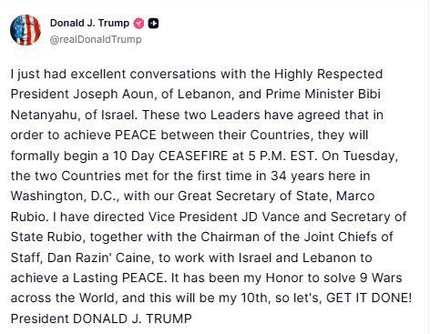 Trump dijo que habló con su homólogo libanés, Joseph Aoun, y con Netanyahu antes de declarar el alto el fuego.