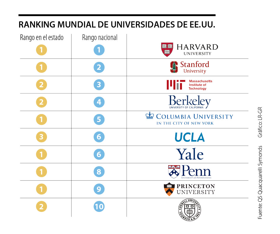 Estos resultados se traducen en que “Harvard produce la investigación más impactante de Estados Unidos y los graduados más empleables”, reseñó QS en la más reciente entrega. Otras de las universidades que se encuentran en el top 10 de este ranking son University of California, Berkeley, Columbia University, University of California, y otras (ver gráfico).