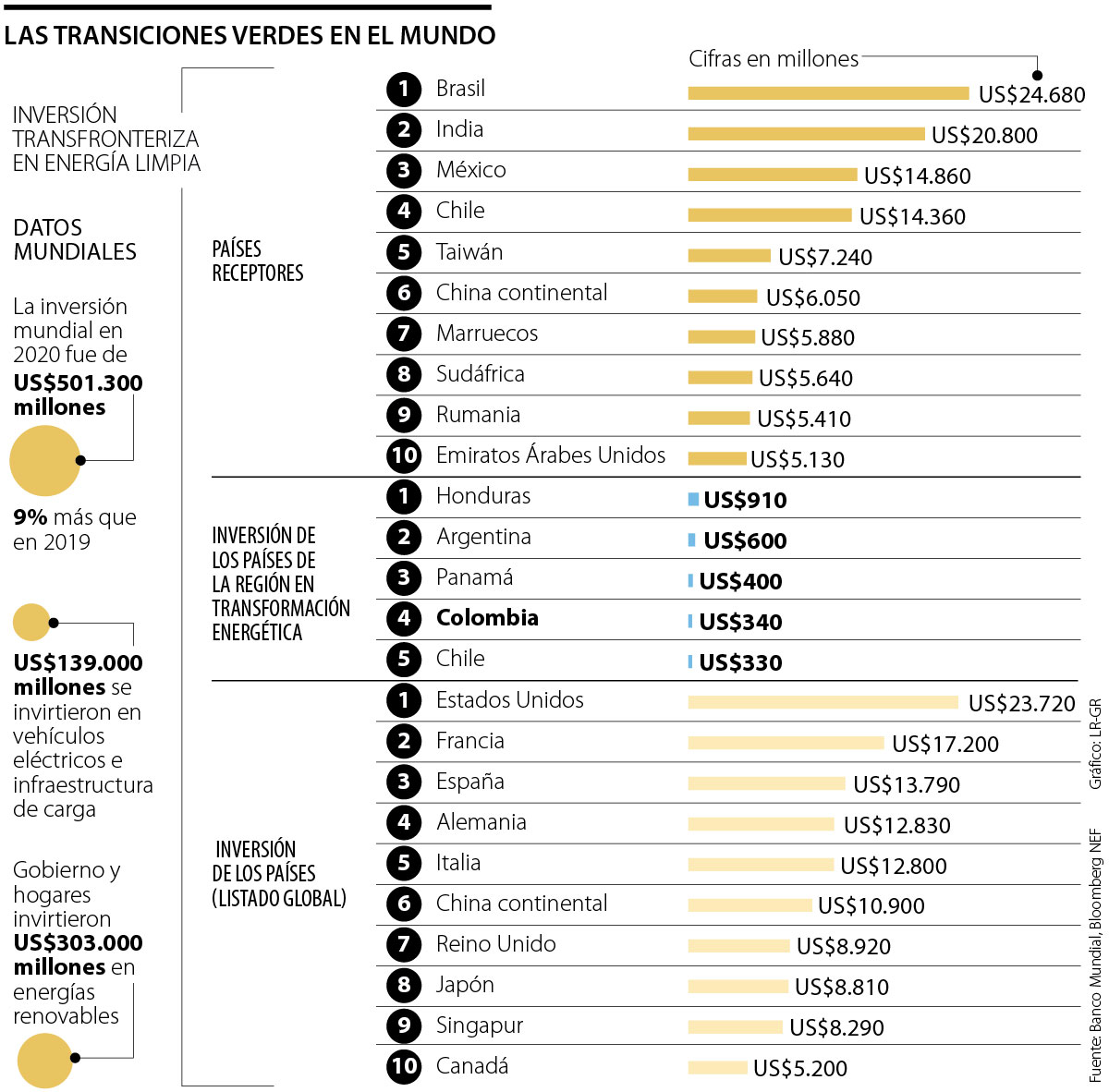 En Latinoamérica, los que invirtieron más en transición energética fueron Honduras, con una inversión de US$910 millones; Argentina, con US$600 millones; Panamá, con US$400 millones; Colombia, con US$340 millones, y Chile, que destinó US$330 millones durante el año pasado.