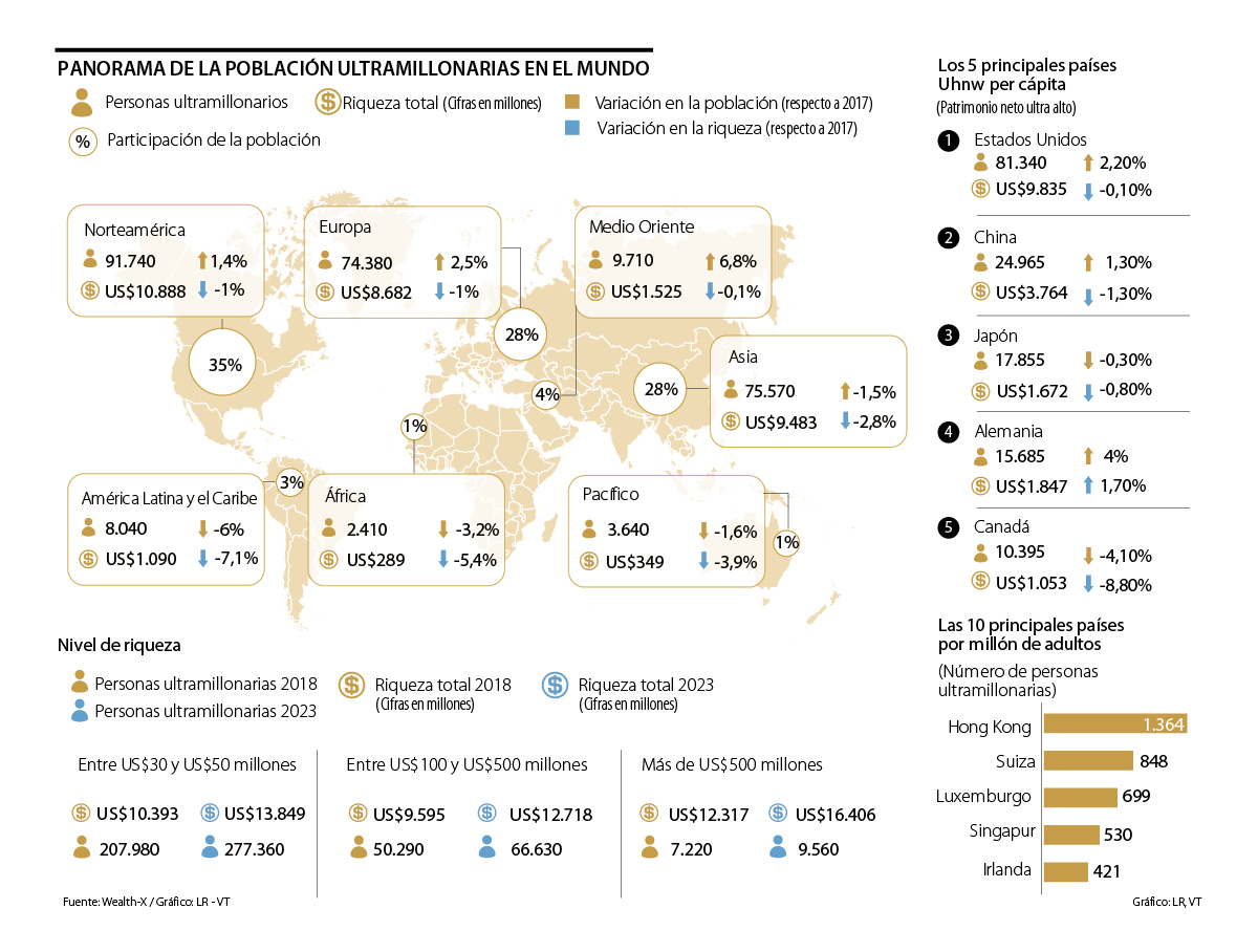 Este grupo de ultramillonarios acumula en el mundo una riqueza de US$32,30 billones, una suma que aunque sigue siendo alta cayó 1,7% frente a 2017, la primera disminución que se registra en los últimos tres años. Los resultados parten de la base de datos global de registros de Wealth-X.