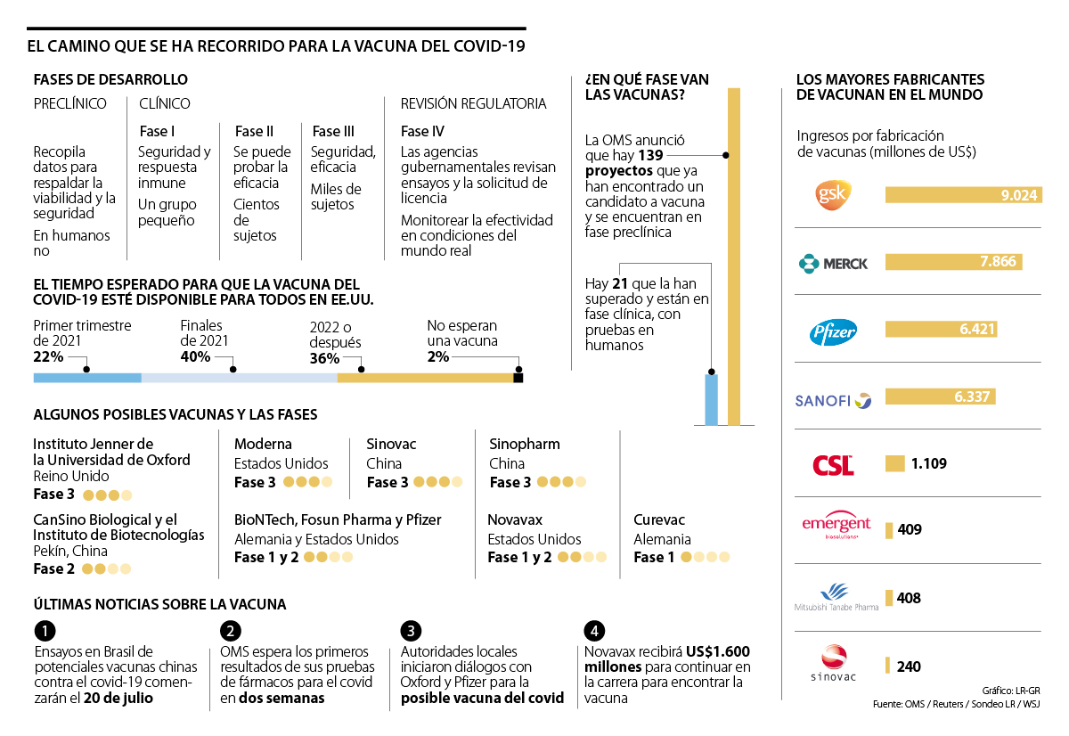 Entre los laboratorios que se encuentran más adelantados en esta carrera se destacan el Instituto Jenner de la Universidad de Oxford (Reino Unido), Moderna (Estados Unidos), Sinovac (China), Sinopharm (China) y CanSino Biologics (China). Todos estos ensayos se encuentran en fase tres, en la que se evalúa la seguridad y eficacia de la vacuna.