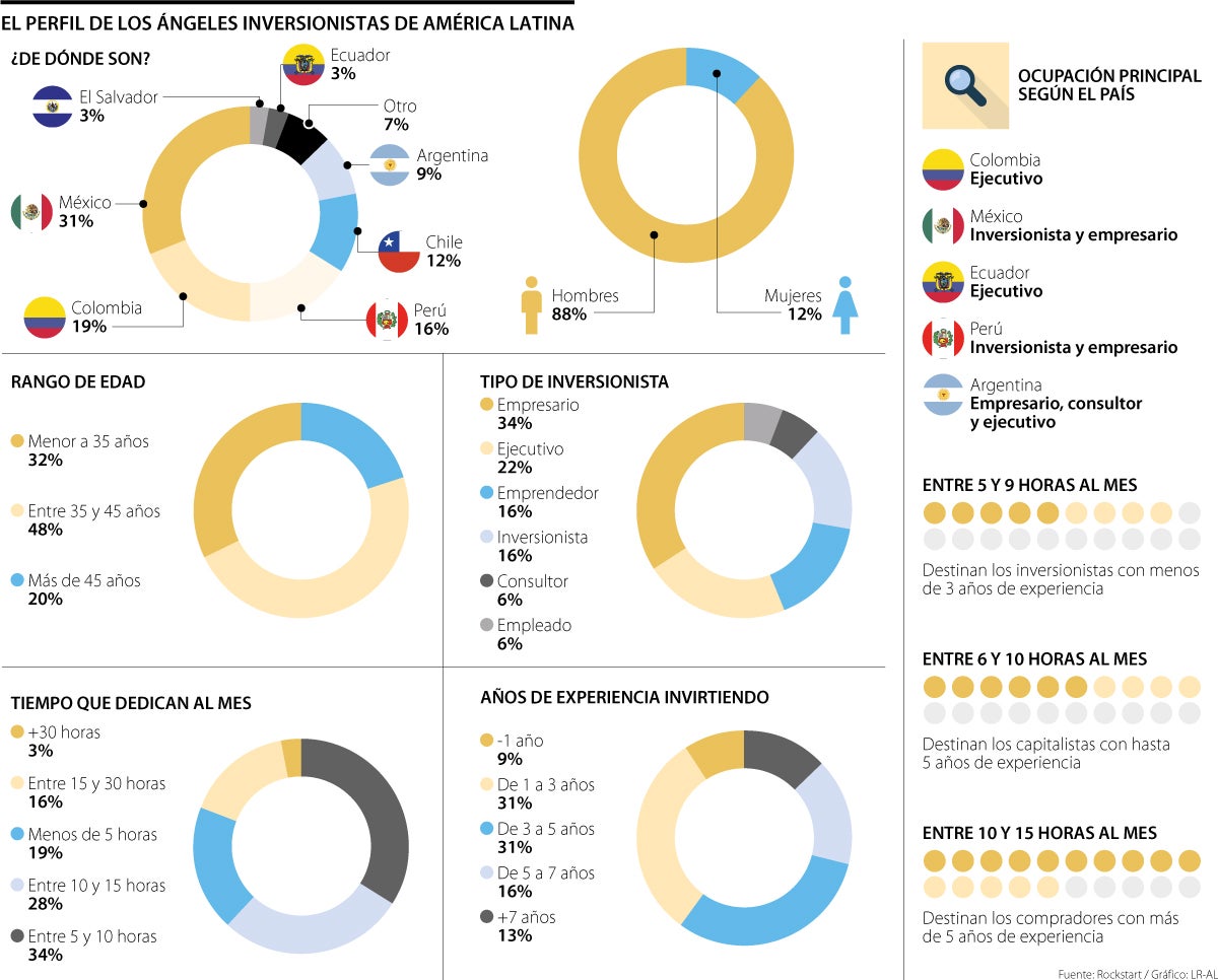 México lidera en número de ángeles en América Latina con 31% de participación; seguido por Colombia, con 19%; Perú, con 16%; Chile, con 12%; Argentina, con 9%; Ecuador y El Salvador, con 3% y otros, con 7%. En México y Ecuador, los compradores son ejecutivos; y en México y Perú, son inversionistas y empresarios.
