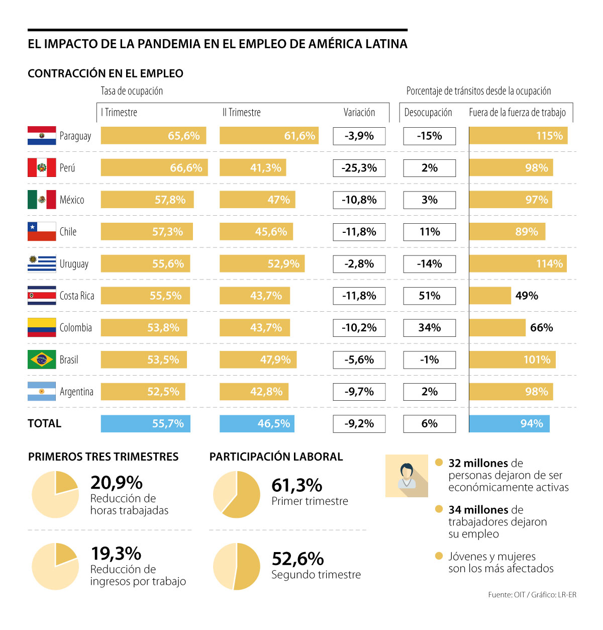 Dentro del panorama laboral, la OIT señala se han perdido unos 34 millones de empleos en la región como consecuencia de la pandemia, lo que representó una caída de 9,2% en la tasa de ocupación. Perú registra la mayor cifra de los países analizados con una caída de 25,3%; Chile y Costa Rica en segundo lugar con -11,8%; México, -10,8% y Colombia con -10,2%.