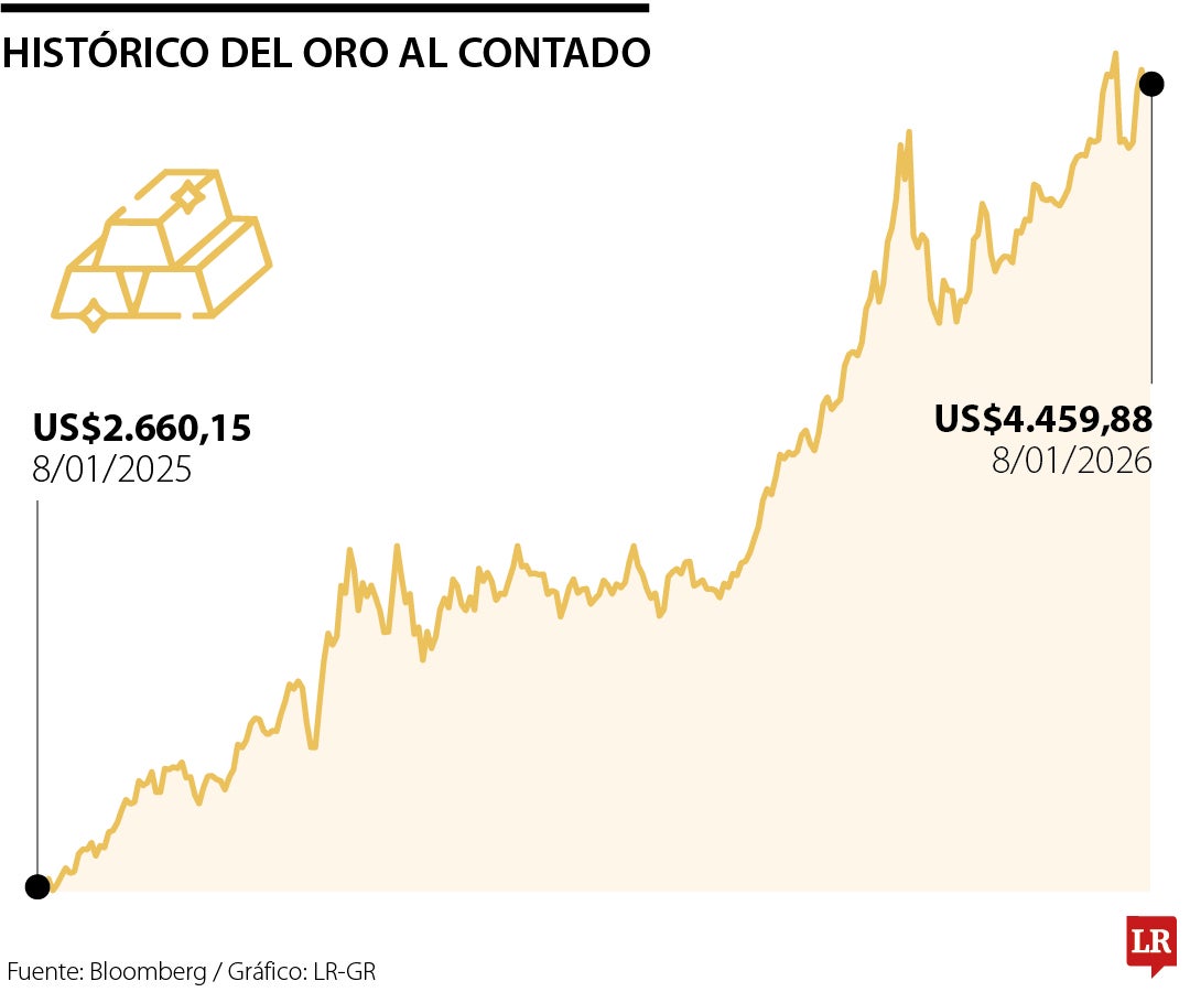 El oro al contado cotizaba el jueves cerca de los US$4.427,48, tras una subida anual de 64% en 2025, la mayor desde 1979.