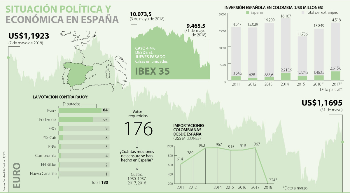 Además, el Ibex acumula una caída de 5,1% desde comienzos de mes. La salida de Rajoy del poder llegó el mismo día en el que el Instituto Nacional de Estadística confirmó que el Producto Interno Bruto del país creció 0,7% en el primer trimestre, con un variación interanual de 3%, una de las más altas en Europa.