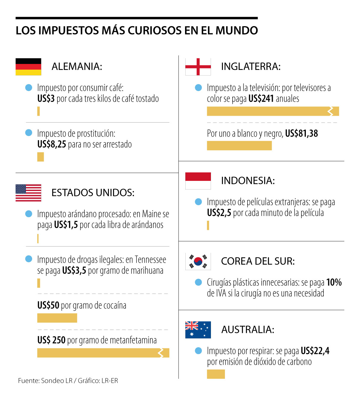 En Indonesia, por ejemplo, hay que pagar US$2,5 al Gobierno por cada minuto de película extranjera que se desee llevar al país. En Corea del Sur, las personas que deseen realizarse cirugías que no sean necesarios, deberán contribuir con 10% adicional.