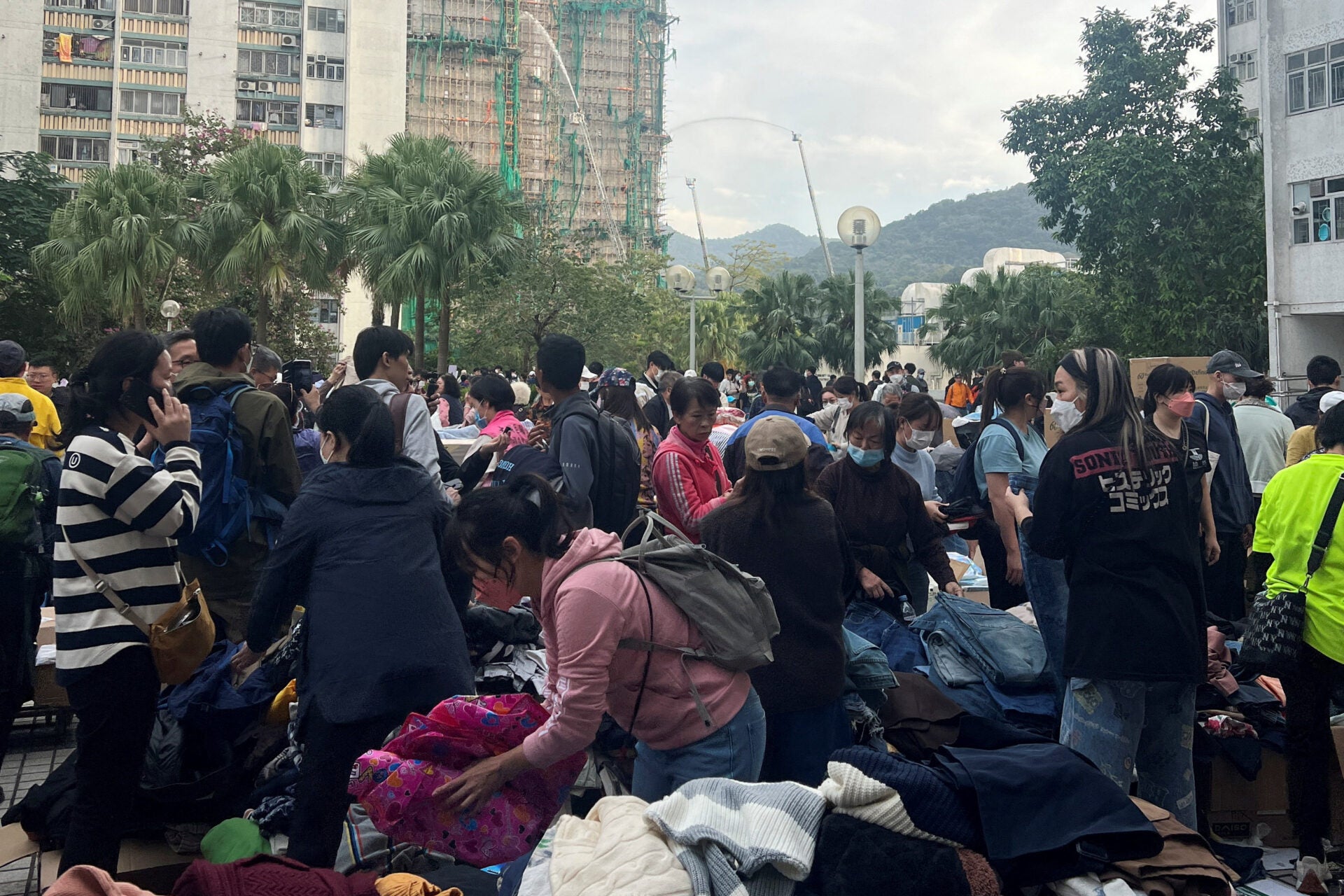 Un vídeo del lugar de los hechos mostró cómo las llamas seguían ardiendo en al menos dos de las torres de 32 pisos cubiertos con malla verde de construcción y andamios de bambú.