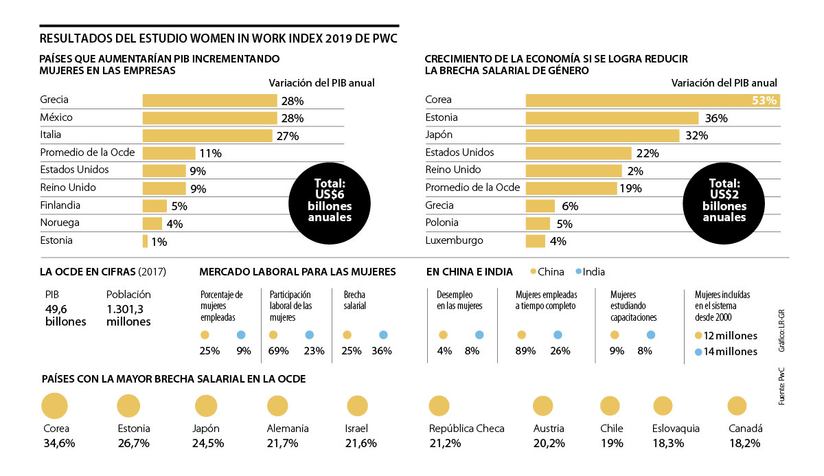 A pesar de que no conforman el club de la Ocde, PwC analizó las condiciones laborales de las mujeres en los dos gigantes asiáticos. Según los resultados, si aumentan las vacantes para mujeres en China, habría una expansión de US$497.000 millones en su PIB y US$2 billones más si se disminuye la brecha salarial. En el caso de India, el PIB aumentaría US$7 billones con más mujeres empleadas y US$245.000 millones si se reduce la inequidad.