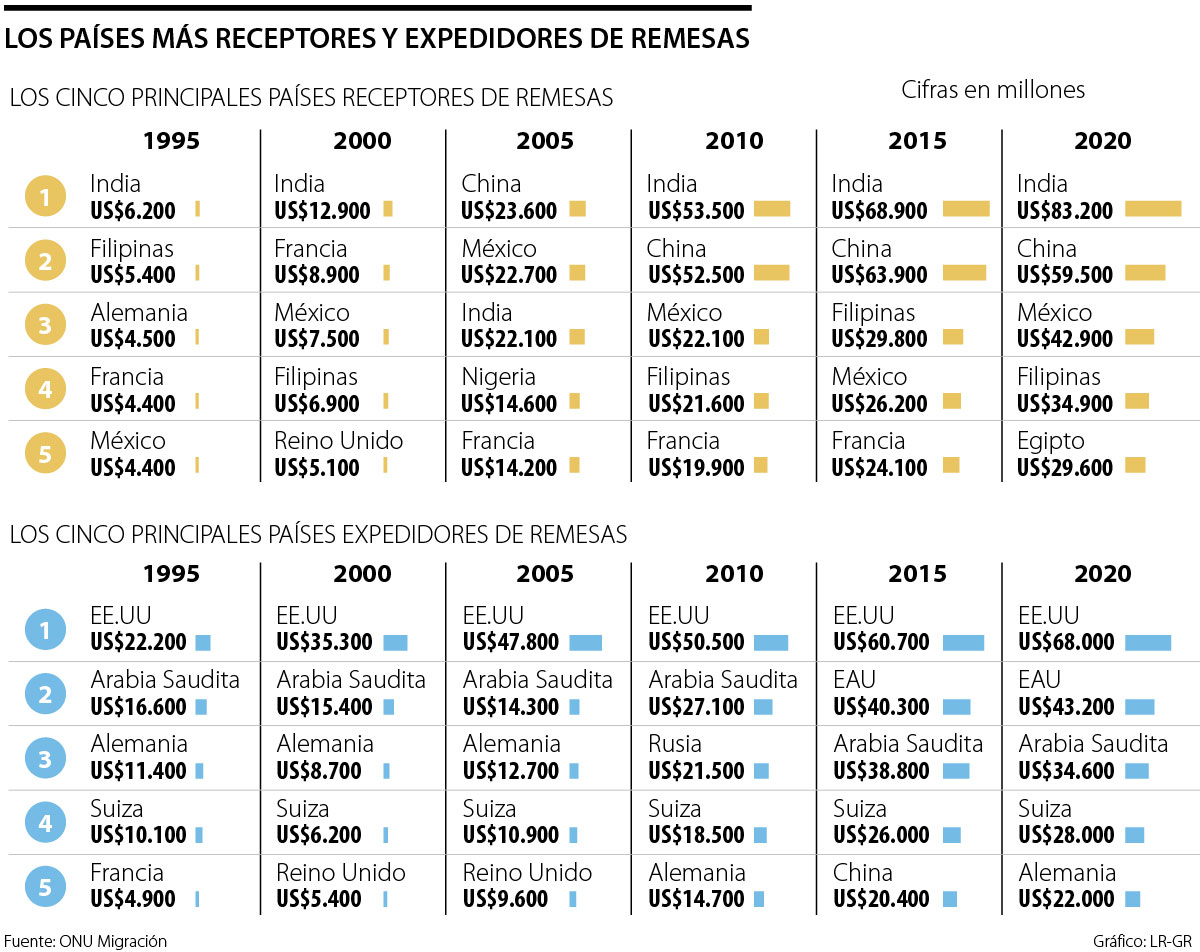 De este modo, India vuelve a ser el principal receptor mundial de remesas, con US$83.200 millones en 2020. Mantiene así un primer lugar que ha sostenido, por lo menos, durante 10 años.