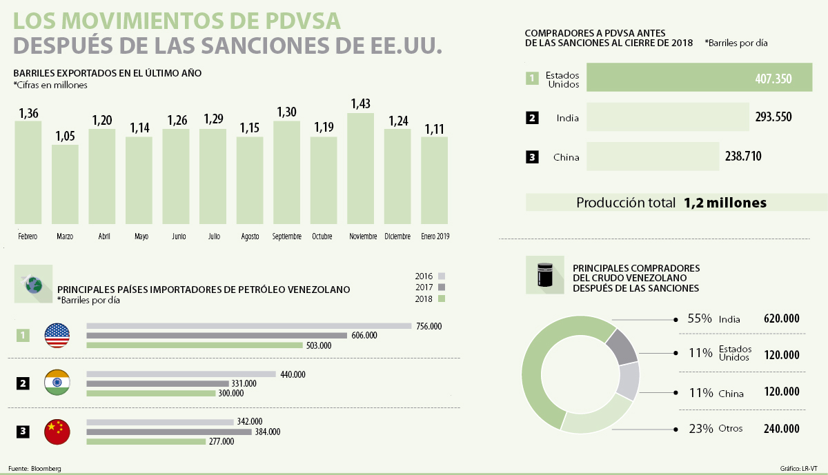 Calificada como el peor declive económico en el mundo después del fin de la Guerra Fría, la crisis venezolana sigue agravándose tras las sanciones que el Departamento del Tesoro, en Estados Unidos, le impuso a Petróleos de Venezuela (Pdvsa). A raíz de los impedimentos, las refinerías indias Reliance Industries y Nayara Energy, respaldadas por Rosneft Oil Co PJSC, han captado 55% de la producción de la estatal venezolana con 620.000 barriles diarios, un aumento de 66% respecto a enero de 2018.