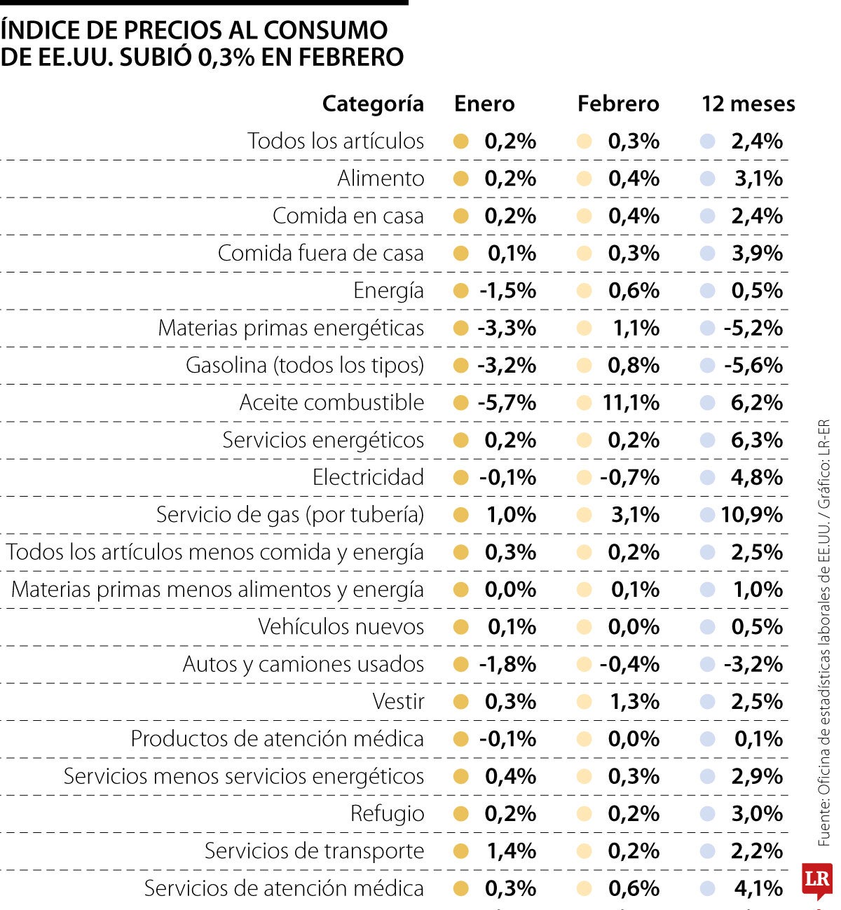El índice de precios al consumo subió 0,3% el mes pasado, tras el alza de 0,2% de enero, informó el miércoles la Oficina de Estadísticas Laborales del Departamento de Trabajo. Los economistas encuestados por Reuters habían pronosticado que el IPC subiría 0,3%. Los precios de la gasolina habían bajado dos meses consecutivos.