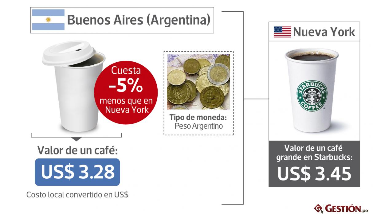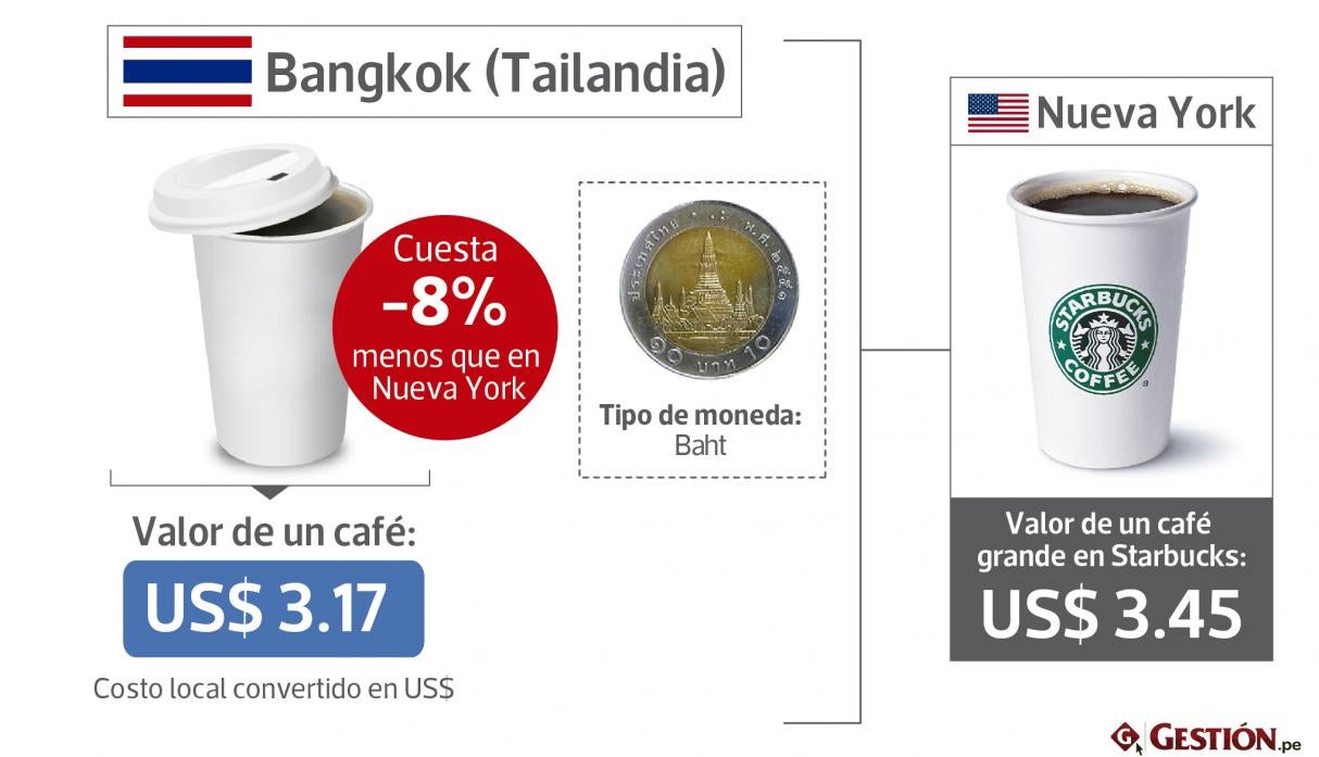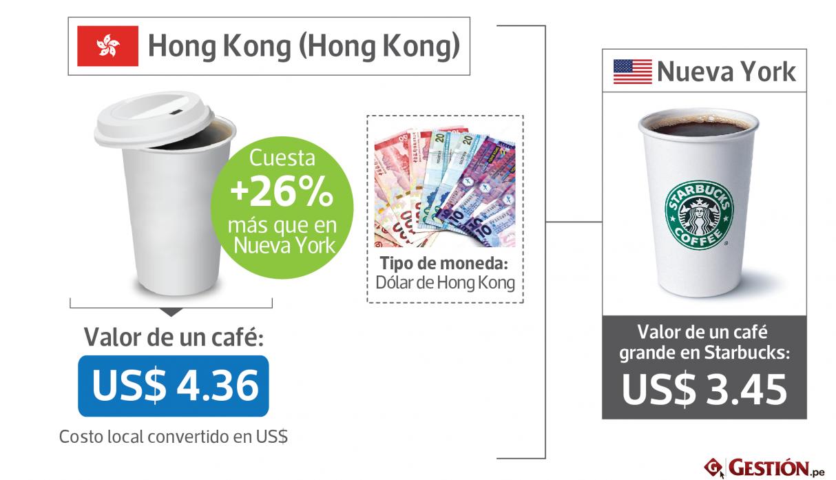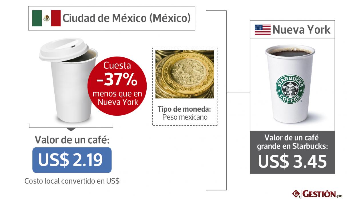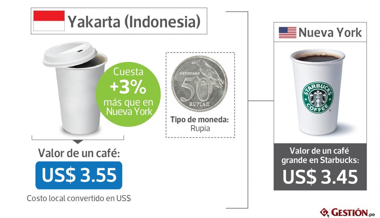 En este caso, el WSJ rastreó el precio de un café con leche grande de Starbucks en docenas de ciudades de todo el mundo. Estos precios luego se convierten a dólares estadounidenses y se comparan con el precio de referencia, que es un café con leche alto de Starbucks en la ciudad de Nueva York (US$3,45).
