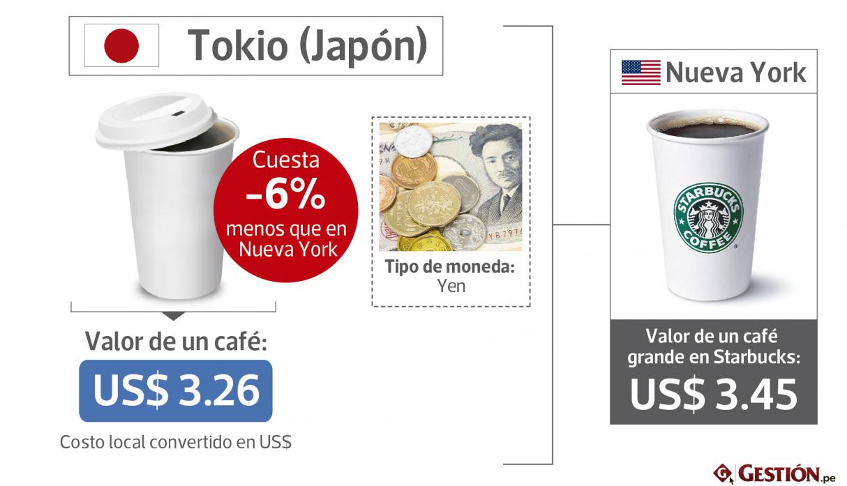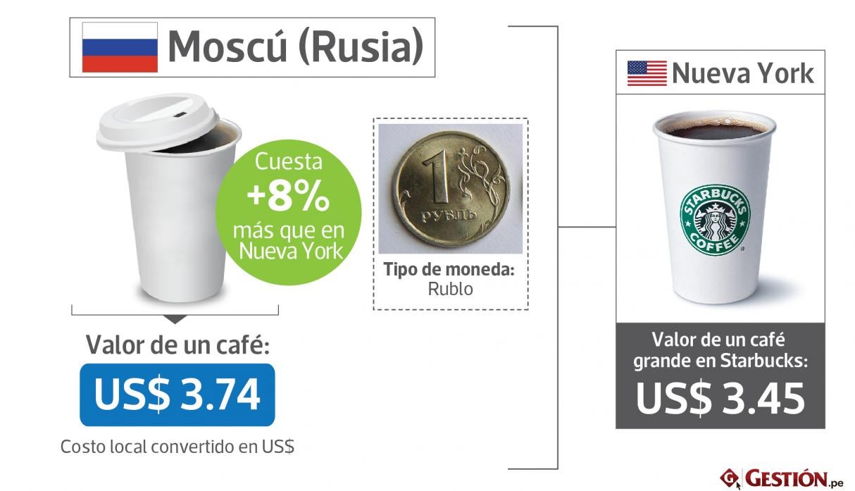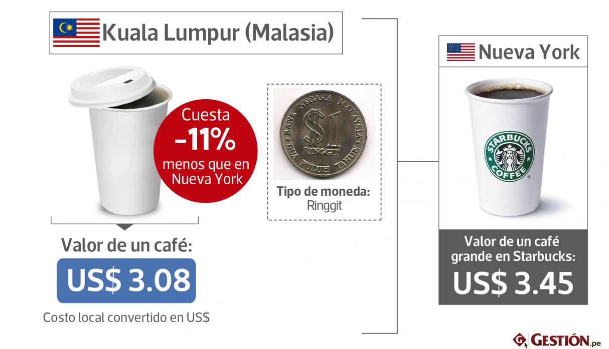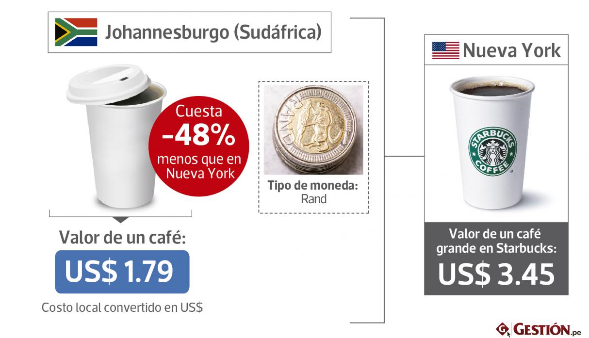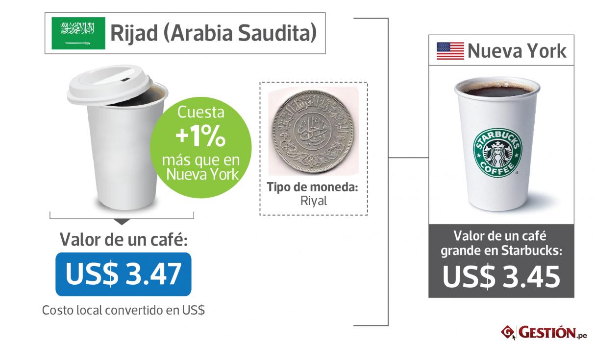 En este caso, el WSJ rastreó el precio de un café con leche grande de Starbucks en docenas de ciudades de todo el mundo. Estos precios luego se convierten a dólares estadounidenses y se comparan con el precio de referencia, que es un café con leche alto de Starbucks en la ciudad de Nueva York (US$3,45).