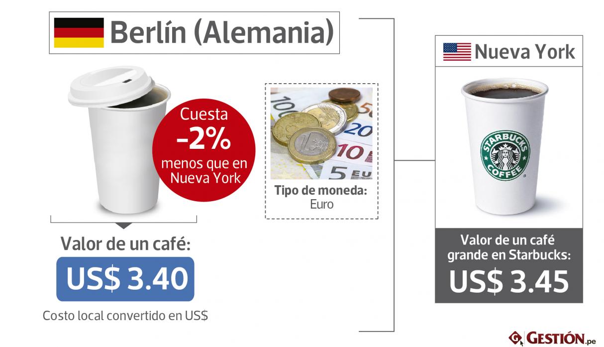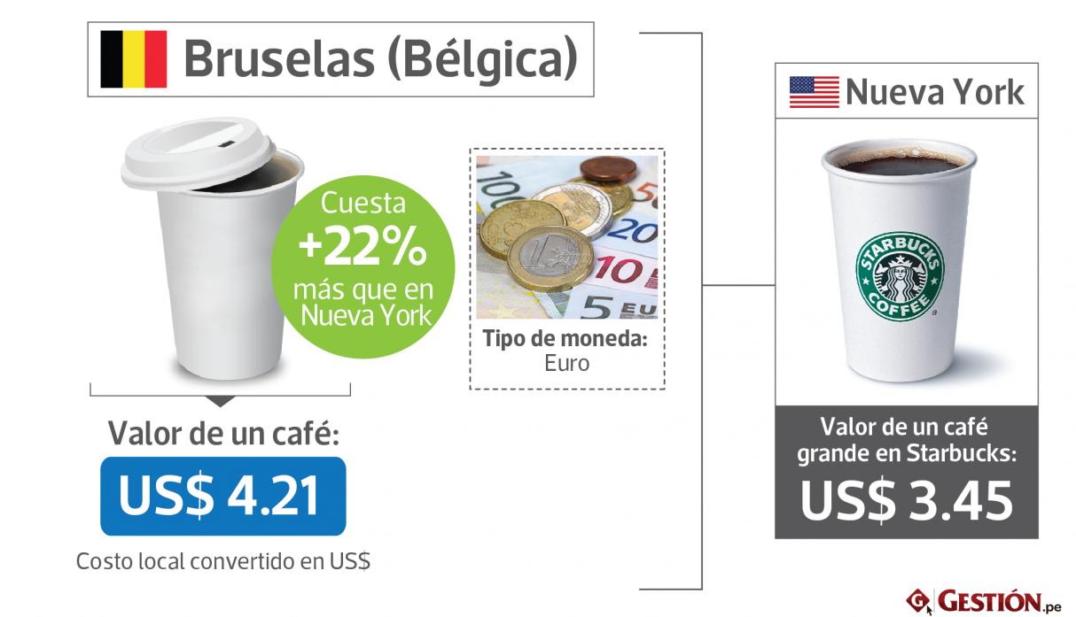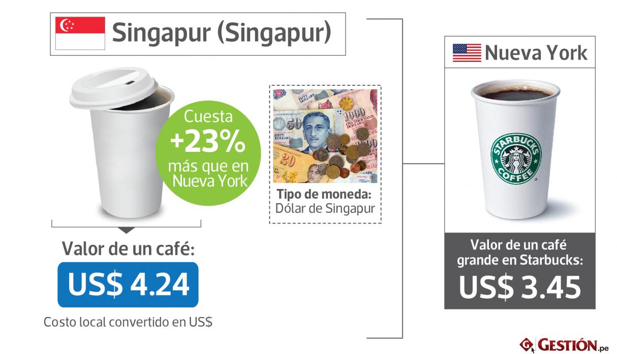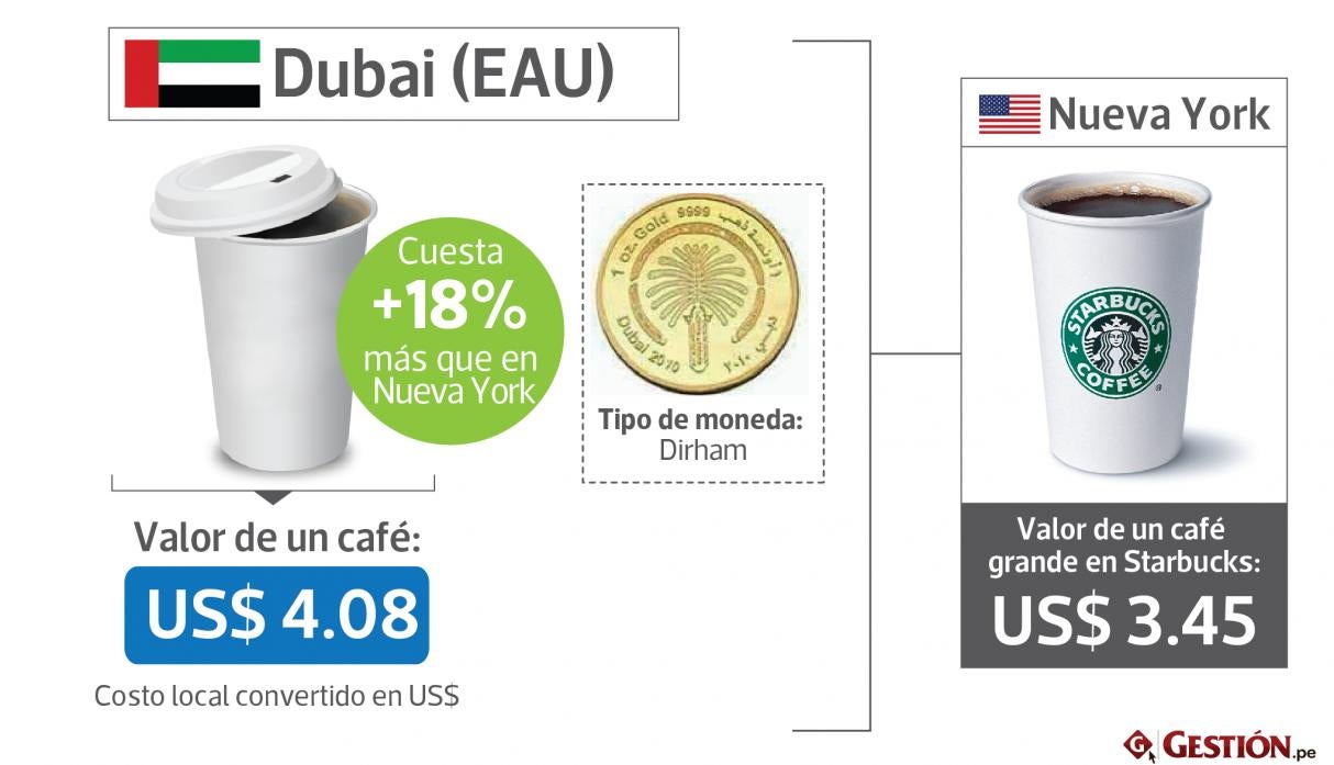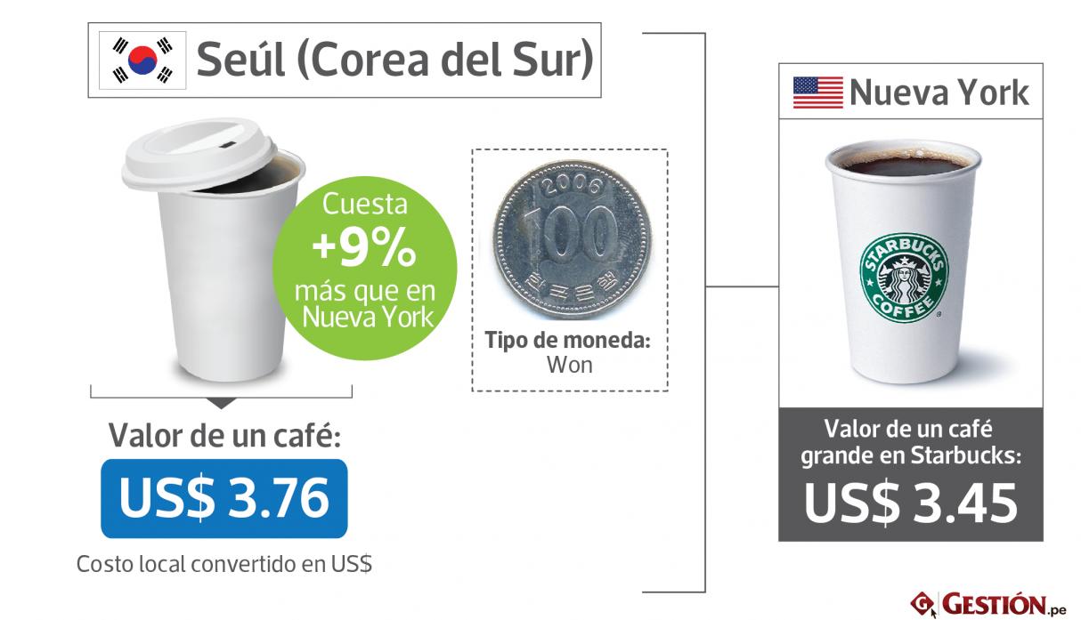 En este caso, el WSJ rastreó el precio de un café con leche grande de Starbucks en docenas de ciudades de todo el mundo. Estos precios luego se convierten a dólares estadounidenses y se comparan con el precio de referencia, que es un café con leche alto de Starbucks en la ciudad de Nueva York (US$3,45).