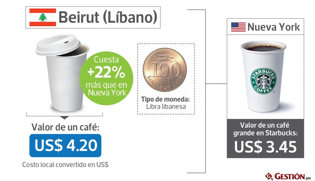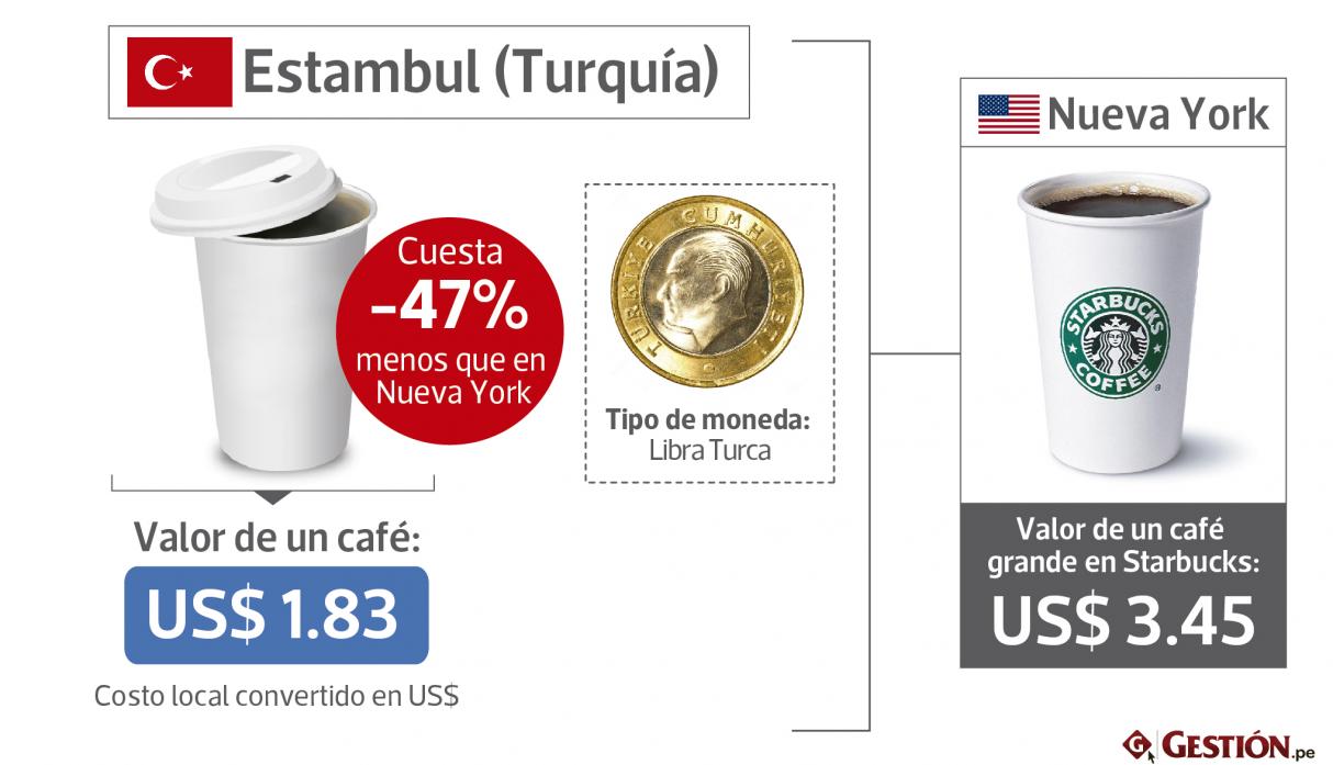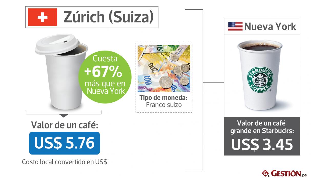 En Zúrich por su parte, el latte cuesta 67% más que en Nueva York, por lo que el franco suizo estaría sobrevalorado en esa cuantía.