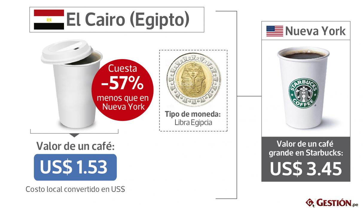 En el otro extremo está el precio del café en El Cairo, donde el precio en libras egipcias está 57% por debajo de producto en Nueva York.
