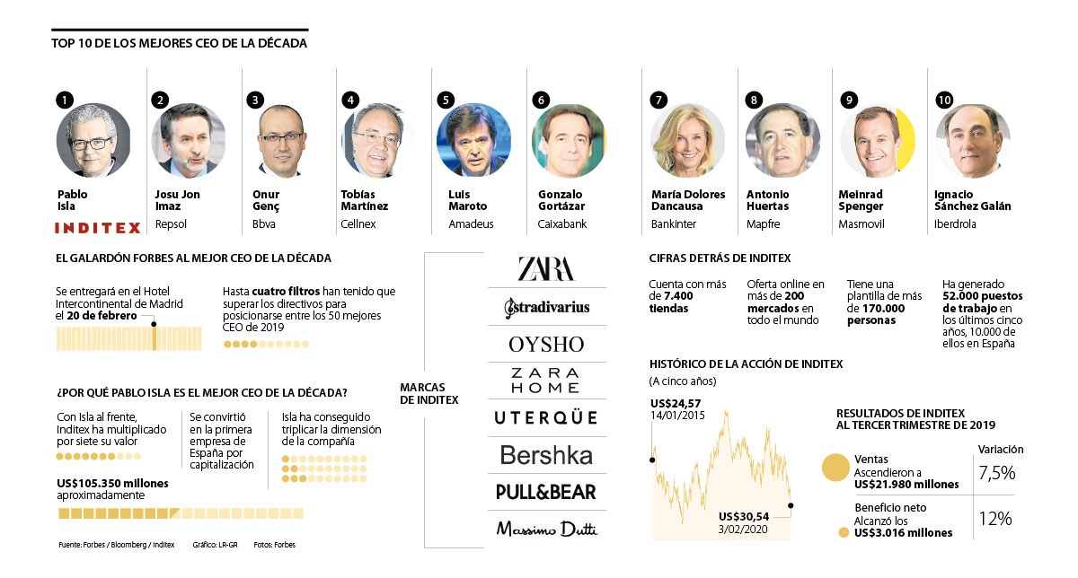Detrás del éxito y el posicionamiento que ha alcanzado este imperio textil en la última década (2009 - 2019) está Pablo Isla, quien fue elegido por Forbes como el mejor CEO del decenio por los logros que ha alzado al frente de la multinacional. Entre los objetivos que logró se destacan que multiplicó el valor de la empresa por siete, la llevó a los cinco continentes, integró nuevos avances tecnológicos y otras.
