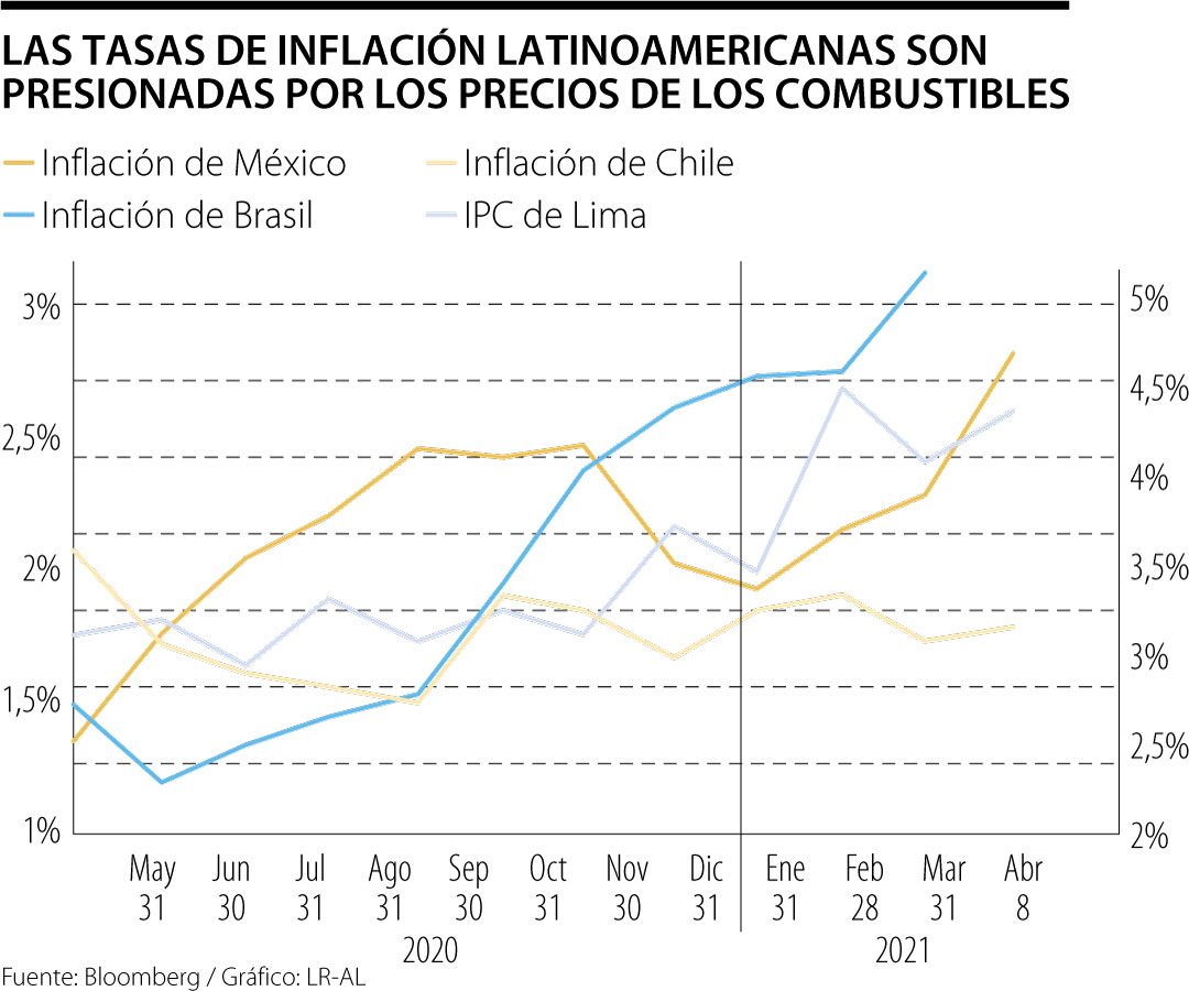 Las crecientes presiones sobre los precios han sido durante mucho tiempo un flagelo que erosiona el atractivo de muchos bonos y monedas de mercados en desarrollo. Ahora, los datos de todo el mundo vuelven a mostrar señales de advertencia. En marzo, las cifras de inflación de Estados Unidos superaron las estimaciones, mientras que el IPC también repuntó en México, Perú y Brasil debido a un aumento en los costos de la energía y los alimentos. Mientras tanto, los bancos centrales enfrentan presiones para mantener bajas las tasas para contener las consecuencias económicas de la pandemia de coronavirus.