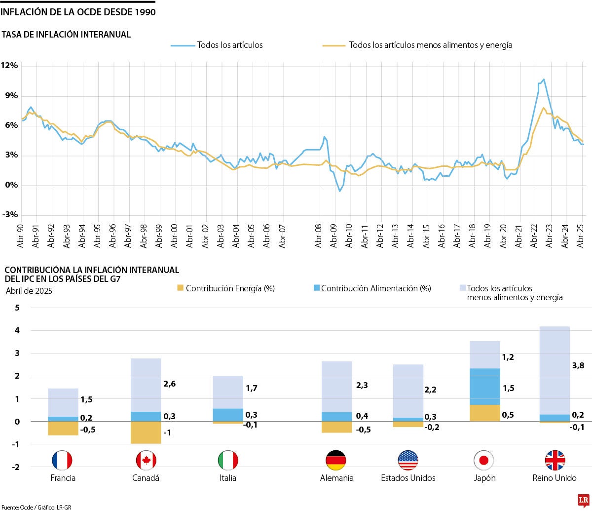 En el grupo de las siete economías más industrializadas del mundo, el G7, la inflación general se mantuvo en 2,4% durante abril. Esta estabilidad se dio a pesar de los descensos en los precios de la energía y los alimentos. En la mayoría de estos países, la inflación subyacente sigue siendo el principal factor que impulsa la variación del índice general. Japón fue la excepción, donde la combinación de la inflación de alimentos y energía aportó más que la subyacente, lo que evidencia una estructura inflacionaria distinta en la tercera economía del mundo.