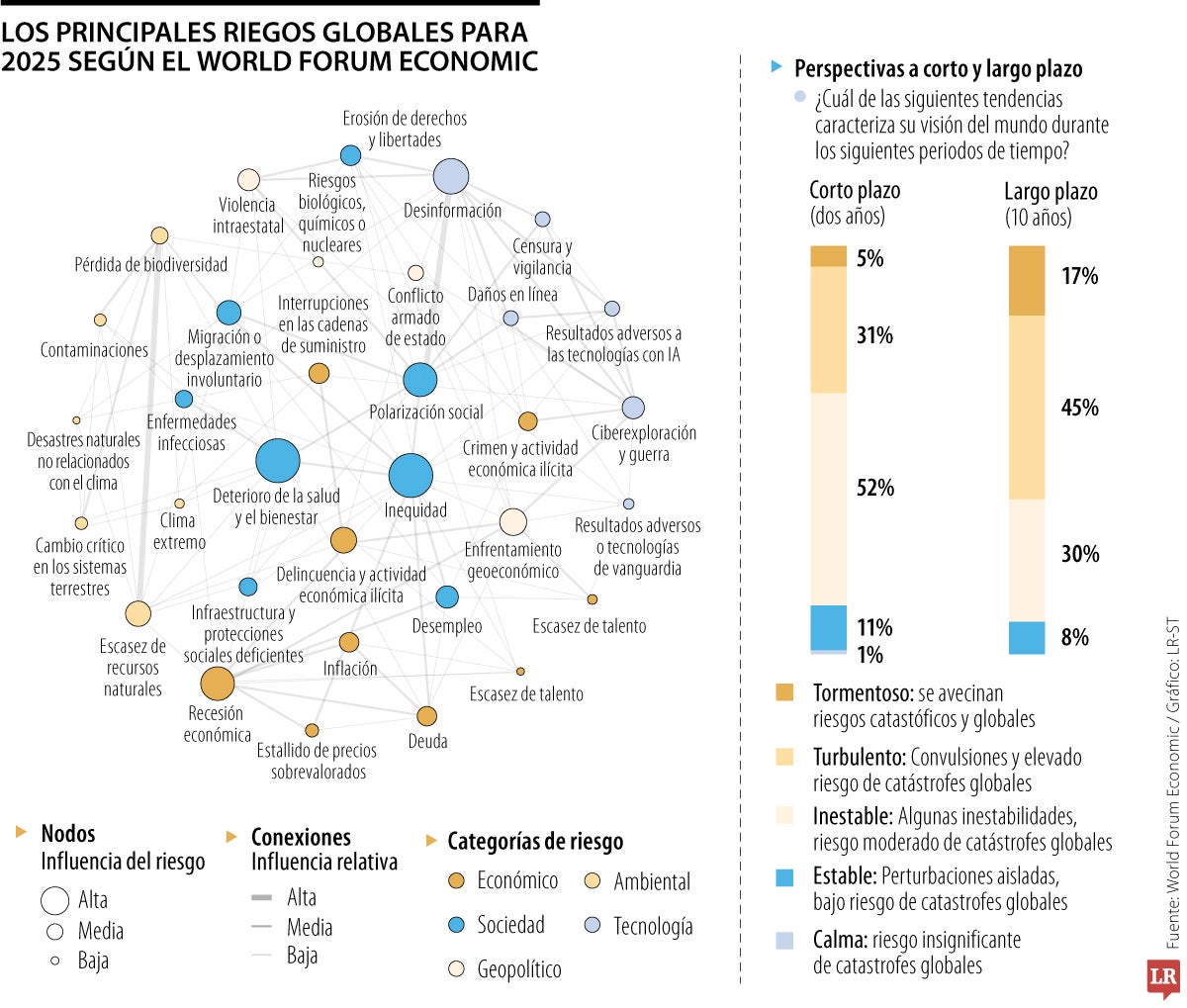 El Foro Económico Mundial, WEF (por sus siglas en inglés) publicó sus reporte sobre los principales riesgos económicos y geopolíticos para 2025. Inflación, guerras estatales, desinformación, inequidad y pérdida de biodiversidad, figuran entre los mayores factores que podrían desestabilizar la sostenibilidad global. Temas que figuran también como un antesala a las conversaciones que se darán el Foro de Davos que iniciará el 20 de este mes.