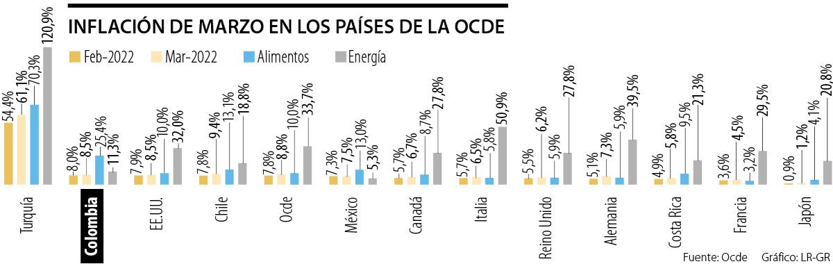 La inflación de Colombia, que fue de 8,53%, estuvo por debajo del promedio de la Ocde en marzo, y es uno de los países en donde menos aumentó. Aunque es la economía con el IPC de alimentos más alto después de Turquía. En el tercer mes del año, la inflación de alimentos en Colombia fue de 25,4%, mientras que la turca se disparó a 70,3%.