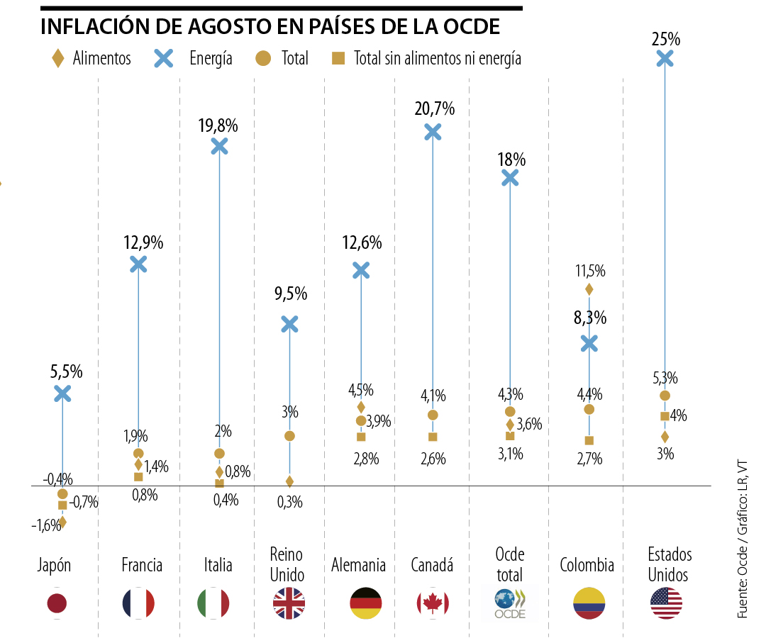 Aunque la tendencia entre los países de la Ocde fue una inflación de energía, más disparada que la inflación de alimentos, en Colombia ocurrió lo contrario en agosto. Los precios de los alimentos en Colombia subieron 11,5%, el segundo aumento más alto de la Ocde, mientras que los precios de la energía aumentaron 8,3%.