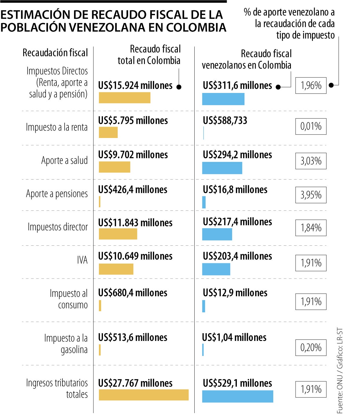 La cifra del impacto económico es una caracterización y estimación de la recaudación por impuestos directos (Impuesto a la renta y aportes por concepto de Seguridad Social a los Sistemas de Salud y Pensiones) e impuestos indirectos (Impuesto al Valor Agregado, impuesto a la gasolina e impuesto al consumo) por parte de la población migrante venezolana. Se estima que solo en IVA, los venezolanos aportaron US$203,4 millones y US$217 millones en impuestos directos.