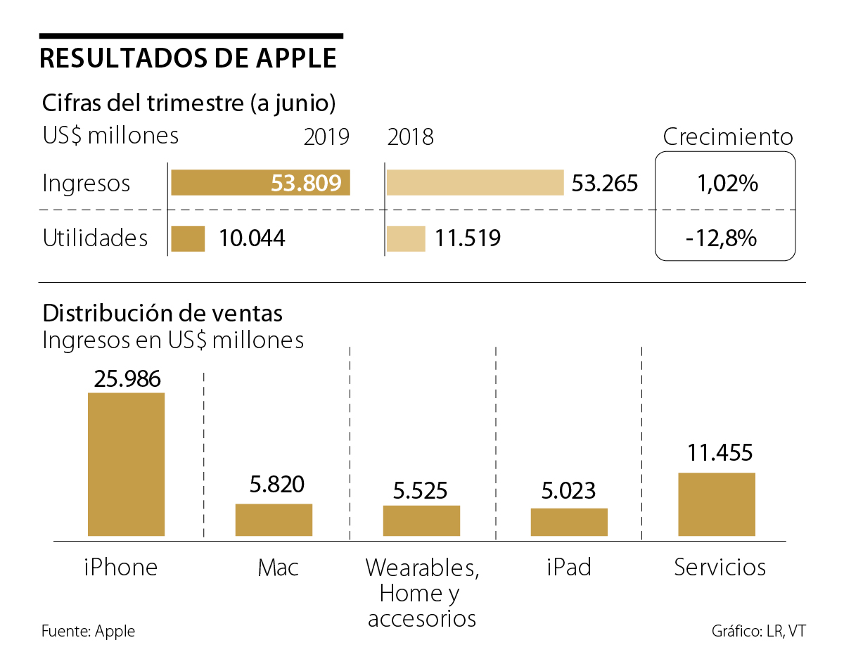 Durante la jornada de ayer, Apple presentó los resultados financieros correspondientes al ejercicio de su tercer trimestre fiscal del año, el cual va desde abril hasta junio. En estos, se evidenció un crecimiento de 1,02% frente a los US$53.265 millones obtenidos en el mismo lapso en 2018. Los ingresos en el trimestre actual de la tecnológica sumaron US$53.809 millones.