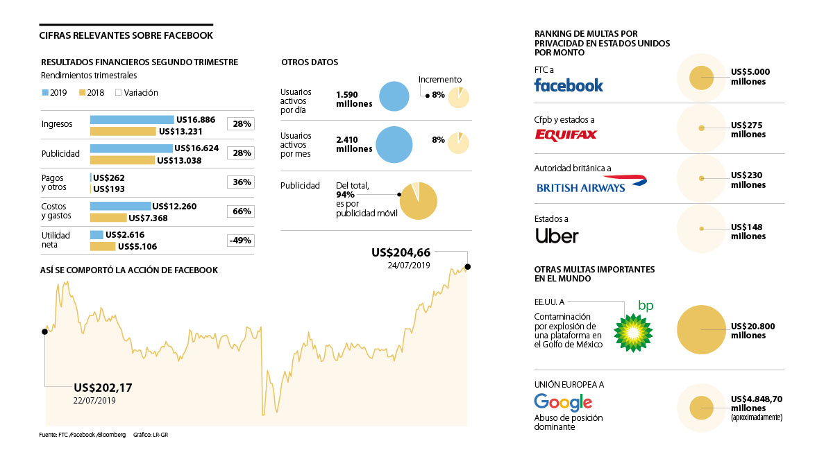 La red social Facebook ayer experimentó una jornada agridulce. Mientras la mañana del miércoles comenzó con la confirmación de una multa de US$5.000 millones, impuesta por la Comisión Federal de Comercio (FTC, por sus siglas en inglés), en la tarde fue noticia los buenos resultados de la compañía correspondientes al segundo semestre del año.