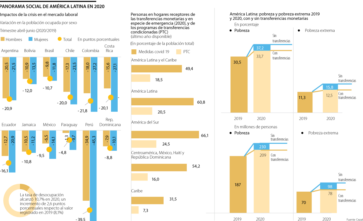 Por efectos de la pandemia, la Cepal destacó que el año pasado se registraron 209 millones de personas en condición de pobreza y 78 millones de personas en extrema pobreza, lo que significó un aumento de 22 millones y ocho millones de personas, respectivamente, con relación a 2019.