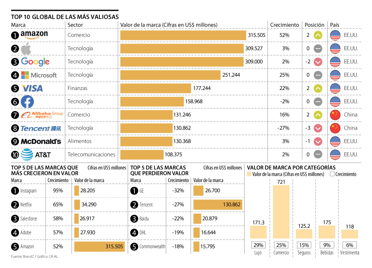El top de los cambios incluyó el ascenso de Amazon, el incremento en dos posiciones de Visa y Alibaba y el descenso en dos puestos de Google y Tencent. Sin embargo, el informe ofrece un dato interesante y son las compañías que más aumentaron su valor de marca. En este competitivo grupo destaca, en la primera posición, Instagram con un crecimiento de 95% sumando US$28.205 millones a su valor de marca. En la segunda posición entraría el grande del entretenimiento, Netflix, con un crecimiento de 65% y un valor de marca de US$34.290 millones. Y en la tercera posición entra la compañía Salesforce, con un crecimiento de 58% y un valor de US$26.917 millones. El podio lo completa en el cuarto lugar Adobe con un crecimiento de 57% y un valor de US$27.930 millones; y en la quinta posición está Amazon, cuyo valor de marca (US$315.500 millones) creció 52%.