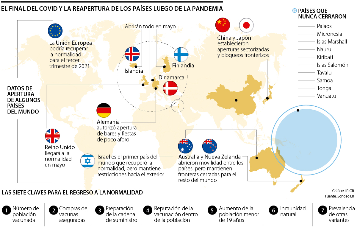 Mientras la tercera ola de contagios se acentúa en algunas economías de América Latina y del mundo son varios los países que han empezado a avanzar en el regreso a la normalidad. Israel, Reino Unido y Nueva Zelanda son algunos de los que han comenzado a levantar las restricciones. Además, hay una lista de pequeñas islas del Pacífico que nunca tuvieron el virus en sus territorios.