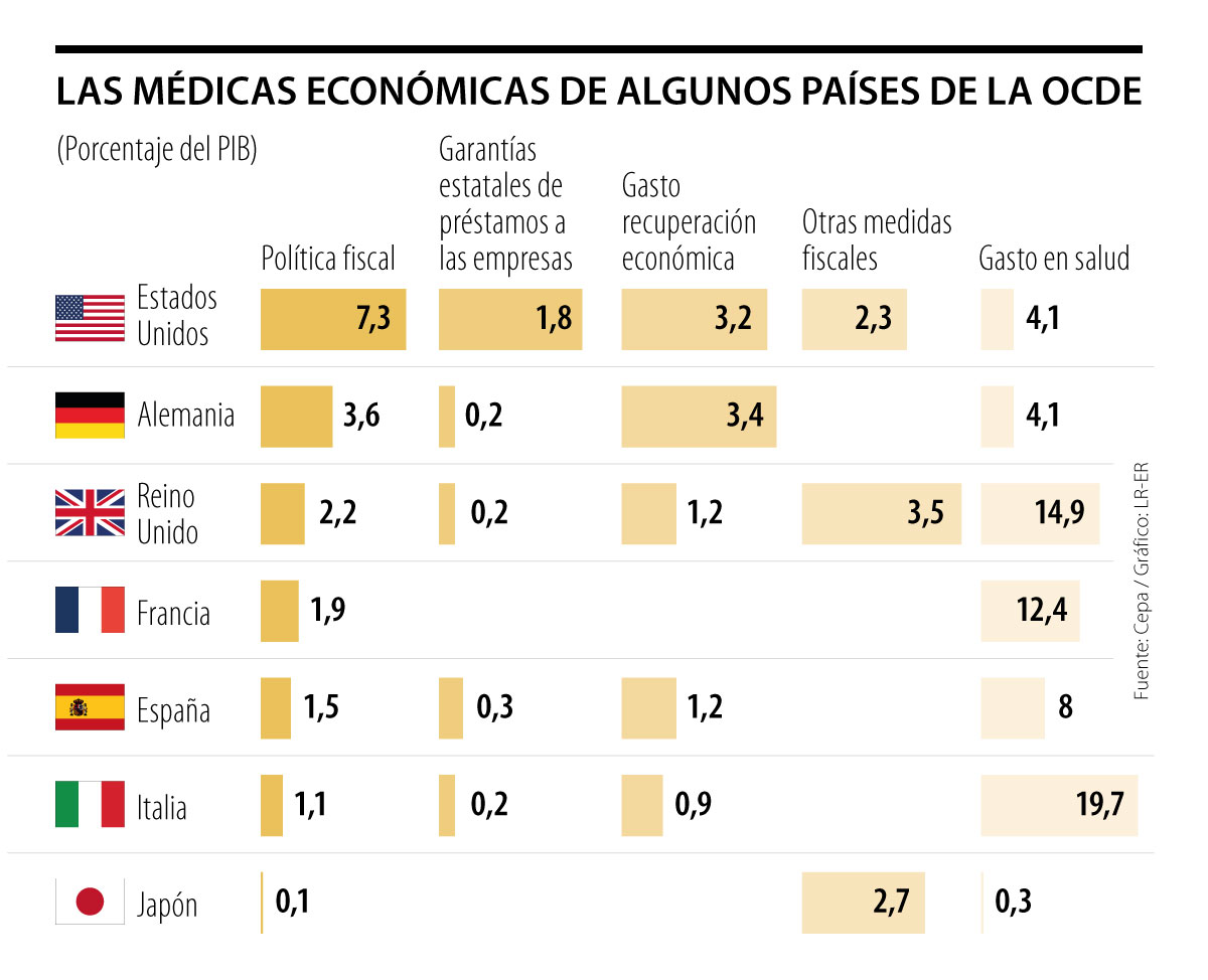 Otros de los países que también han hecho una fuerte apuesta por mitigar el choque económico son Alemania con un monto que supera 10% de su PIB y Francia con un capital de más de 12% de su PIB.