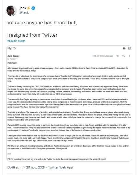 Luego de estas declaraciones públicas, y luego de un viaje a África en 2019 (donde visitó Etiopía, Ghana, Nigeria y Sudáfrica, zonas con negocios emergentes centrados en el Bitcoin), Dorsey renunció a la red social a través de una misiva que publicó en su propia cuenta oficial. Sin embargo, un día antes habría publicado en esta misma red social un tuit sin contexto que decía, 'I love Twitter'.