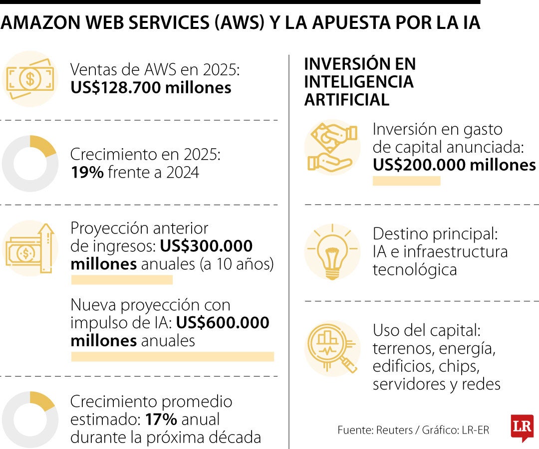 En 2025, AWS registró ventas por valor de US$128.700 millones, 19% más que en 2024. La proyección de Jassy sugiere una tasa de crecimiento promedio de casi 17% anual durante la próxima década. No ofreció detalles sobre cómo se distribuirían esas ventas, y un portavoz de Amazon declinó hacer comentarios más allá de las declaraciones de Jassy.